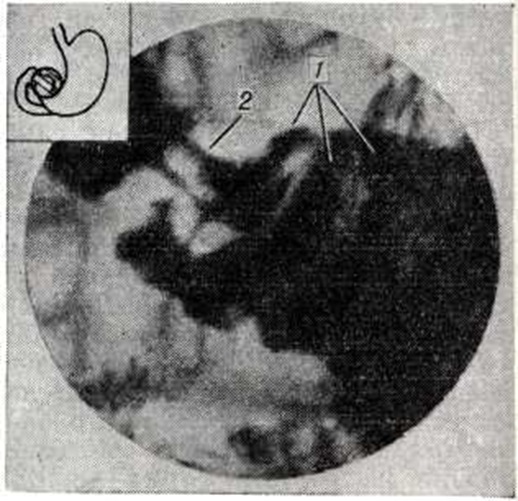 Ригидный гастрит впервые описан А. Н. Рыжих и Ю. Н. Соколовым (1947). Он проявляется упорной диспепсией (смотри) и ахлоргидрией (смотри). Диагноз устанавливается при рентгенологическое исследовании и на основании данных гастроскопии. Преимущественно поражается выходной отдел желудка, который вследствие гипертрофических изменений, отёка и спастического сокращения мускулатуры деформируется, превращаясь в узкий трубообразный канал с плотными ригидными стенками. Полипозный гастрит (цветной рисунок 8) развивается обычно на фоне атрофического Гастрит с гистаминрефрактерной ахлоргидрией, его можно рассматривать как дальнейшее прогрессирование хронический Гастрит (дисрегенераторная гиперплазия слизистой оболочки). Гигантский гипертрофический гастрит или точнее избыточное развитие слизистой оболочки, описанный Менетрие (P. Menetrier, 1886),— относительно редкое заболевание, проявляющееся нарушением обмена веществ (чаще белкового) и очень редко развитием железодефицитной анемии. Изменение кислотообразующей функции желудка бывает различным (смотри также таблица). Диагноз основывается на анализе клин, проявлений болезни, результатах исследования желудочной секреции (смотри Желудок, методы исследования), рентгенологическое исследования, данных гастроскопии (смотри) и гастробиопсии. В оценке морфологически картины слизистой оболочки желудка следует отдавать предпочтение данным гастробиопсии. Эксфолиативная цитодиагностика, определение всасывательной и экскреторной функции желудка имеют второстепенное значение. Определённые трудности возникают при дифференциальной диагностике с функциональными нарушениями желудка, раком желудка (смотри Желудок, опухоли) и язвенной болезнью (смотри). При функциональных нарушениях желудка обычно нет резких морфологически изменений. Кроме того, они имеют относительно кратковременное (до 1 года) течение, меньшую зависимость возникновения болей от приёма пищи, большую изменчивость клинической проявлений, что связано с нервно-психическими влияниями, атипичную локализацию болезненности при пальпации живота и, наконец, резкое колебание кислотности при отдельных исследованиях. Рентгенодиагностика основывается на тщательном рентгенологическое исследовании желудка. При этом определяются перестройки рельефа слизистой оболочки желудка и другие рентгено-функциональные и морфологически симптомы. К ним относятся: избыточная секреция натощак, быстрое нарастание секреторной жидкости, изменения тонуса, стойкая деформация привратниковой части желудка, нарушение перистальтики и другие. Наиболее постоянен симптом увеличенной секреции натощак, проявляющийся иногда горизонтальным уровнем жидкости на фоне желудочного пузыря до приёма бариевой взвеси. Первые один-два глотка взвеси бария подтверждают наличие избытка жидкости. По характеру смешивания бария с жидкостью можно до известной степени судить о количестве содержащейся в ней слизи: медленное смешивание с образованием бесформенных хлопьев указывает на наличие слизи. Другим симптомом наличия слизи (феномен слизи) являются мелкоточечные просветления в слое бариевой взвеси — мельчайшие капельки слизи, взвешенные в суспензии бария. Феномен слизи неразличим при просвечивании и может быть констатирован только на снимках с компрессие