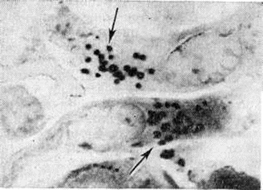 Патологическая анатомияМорфологически изменения при Грипп выражаются повреждениями органов дыхания и токсическим поражением других органов и систем. Выраженность этих изменений зависит от вирулентности возбудителя, состояния специфического и неспецифического иммунитета, а также от характера сопутствующих болезней и бактериальных осложнений. Для местных изменений при Грипп характерны слизистая и вакуольная дистрофия эпителия, частичная гибель его на протяжении дыхательных путей с последующими реактивными изменениями. Характерен серозный, катарально-гнойный, геморрагический и некротический ринит (смотри полный свод знаний), ларингит (смотри полный свод знаний) и трахеобронхит (смотри полный свод знаний Трахеит). В мазках-отпечатках со средней носовой раковины обнаруживается большое количество дистрофизированных клеток цилиндрического эпителия, в цитоплазме которых нередко обнаруживаются оксифильные включения. Наиболее резко поражаются подсвязочная область гортани, трахеи и крупные бронхи (рисунок 1), а также слизистая оболочка языка. Слизистая оболочка — огненно-красная, нередки точечные кровоизлияния и островки желтоватого цвета (очаги некрозов). В более тяжёлых случаях слизистая оболочка трахеи и крупных бронхов на всем протяжении серовато-жёлтого цвета, с небольшими участками кровоизлияний (цветной рисунок 2 и 3). Гистологически эпителий трахеи и бронхов принимает вид аркадообразных структур, возникающих за счёт отёка (смотри полный свод знаний), вакуолизации (смотри полный свод знаний) и отслойки поверхностных слоёв клеток, содержащих вирусный антиген. Часто наблюдается образование фуксинофильных цитоплазматических включений (рисунок 2) и развитие регенераторных (псевдометапластических) процессов. Клетки бронхиального эпителия под действием вируса Грипп теряют ворсинки, количество гранул в них резко уменьшается. Цитоплазматические включения представляют собой аутофагосомы, образующиеся в зоне парциального некроза цитоплазмы вследствие репродукции вируса Грипп (рисунок 3). Резкое полнокровие, отёк и круглоклеточная инфильтрация подэпителиальных слоёв сочетается с утолщением базальной мембраны и усилением секреции образующих слизь желёз. В других местах отмечается гибель эпителия, выраженное полнокровие и лейкоцитарная инфильтрация субэпителиального слоя бронхов и гнойный экссудат с колониями микробов в просвете дыхательных путей. Такого рода очаги гнойно-некротического трахеобронхита служат источником бактериальных поражений лёгочной ткани. При макроскопическом изучении в лёгких отмечается резкое полнокровие, отёк, очаги острой эмфиземы (смотри полный свод знаний Эмфизема лёгких), нередки участки уплотнения интенсивно-красного цвета с гладкой поверхностью разреза, а также гнойный бронхит (смотри полный свод знаний) и бронхиолит (смотри полный свод знаний), участки гнойной, абсцедирующей пневмонии и плевриты (цветной рисунок 3), обычно развивающиеся в случаях присоединения бактериальной, чаще стафилококковой, инфекции («пёстрые» гриппозные лёгкие). Гистологически часто обнаруживают очаги ателектаза, утолщение межальвеолярных перегородок за счёт белкового пропитывания и полнокровия, дистрофию и десквамацию альвеолоцитов. В просвете альвеол, кроме разрушающихся альвеолоцито
