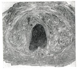 В предстательной железе в практическом отношении принято различать: верхнюю, или переднюю, — краниальную часть и нижнюю, или заднюю,— каудальную часть; с возрастом различие строения этих частей выявляется отчетливее (рис. 1 и 2). Аденома развивается в краниальной части, а рак — в каудальной. Аденома и рак предстательной железы могут сосуществовать у одного и того же больного одновременно. Патологическая анатомия.Предстательная железа при аденоме увеличена; вес ее может достигать 80—100 г и более. Микроскопически выделяют железистую, фиб-розно-мышечную и смешанную формы аденомы предстательной железы. Аденоматозные узлы построены из тесно расположенных ветвистых желез, образующих многочисленные крипты и сосочковые выросты. Железы выстланы 1—2 слоями клеток высокого призматического эпителия. В просвете желез — сгустившийся секрет, амилоидные тельца, скопления лейкоцитов. Строма узлов состоит из зрелой фиброзно-мышечной ткани, бедной клеточными элементами. Встречаются лейкоцитарные и лимфо-гистиоцитарные инфильтраты, абсцессы, очаги некроза. При фиброаденоматозных структурах узлы состоят из редко разбросанных железистых элементов трубчато-альвеолярного строения. Строма узлов богата клетками типа фибробластов. Тубулярная аденома встречается редко. Узлы обычно единичные; они построены из извилистых или выпрямленных трубочек, выстланных одним рядом высоких призматических клеток с бледно окрашивающейся цитоплазмой и базально расположенными ядрами. Ядра гиперхромные без фигур деления. Фиброзно-мышечные узлы, сфероиды, можно видеть почти во всех случаях наряду с узлами железистого строения. Эти узлы, как правило, множественные, редко превышают 1—2 сантиметра в диаметре. Они состоят из богатой клеточными элементами волокнистой ткани, напоминающей строму предстательной железы эмбриона; чаще в них преобладают клетки мышечного типа. В толще таких узлов можно видеть примитивно построенные трубочки, выстланные плоским, кубическим, реже однорядным высоким призматическим эпителием. Клиническая картина.Большинство урологов различает в клиническом течении аденомы предстательной железы три стадии; некоторые — четыре стадии (выделив IV стадию из III): I стадия — предвестников (начальных стертых симптомов), II стадия — гиперемии (период дизурии и дистонии), III стадия — неполной хронической задержки мочи (период остаточной мочи), IV стадия — парадоксальной ишурии (период неполной задержки мочи с растяжением сфинктеров мочевого пузыря). Iстадия (преклиническая) наблюдается чаще у больных в возрасте 50—60 лет, страдавших ранее нарушениями кровообращения мочеполовой системы (на почве перенесенных инфекций). Известно, что более чем у трети мужчин свыше 35 лет в предстательной железе и семенных пузырьках возникают застойные явления и инфекция [Лидер (A. J. Leader)]. В возрасте после 50 лет с развитием аденомы предстательной железы возникают ранние симптомы в виде незначительных нарушений акта мочеиспускания, неприятных ощущений в промежности, внизу живота, в заднем отделе мочеиспускательного канала. Эта ранняя симптоматика объясняется предшествующей аденоме предстательной железы фазой гистиоцитарной инфильтрации в рефлексогенной зоне внутри пузырного треугольника, которая действует как раздражающий фактор. Ранним признаком аденом